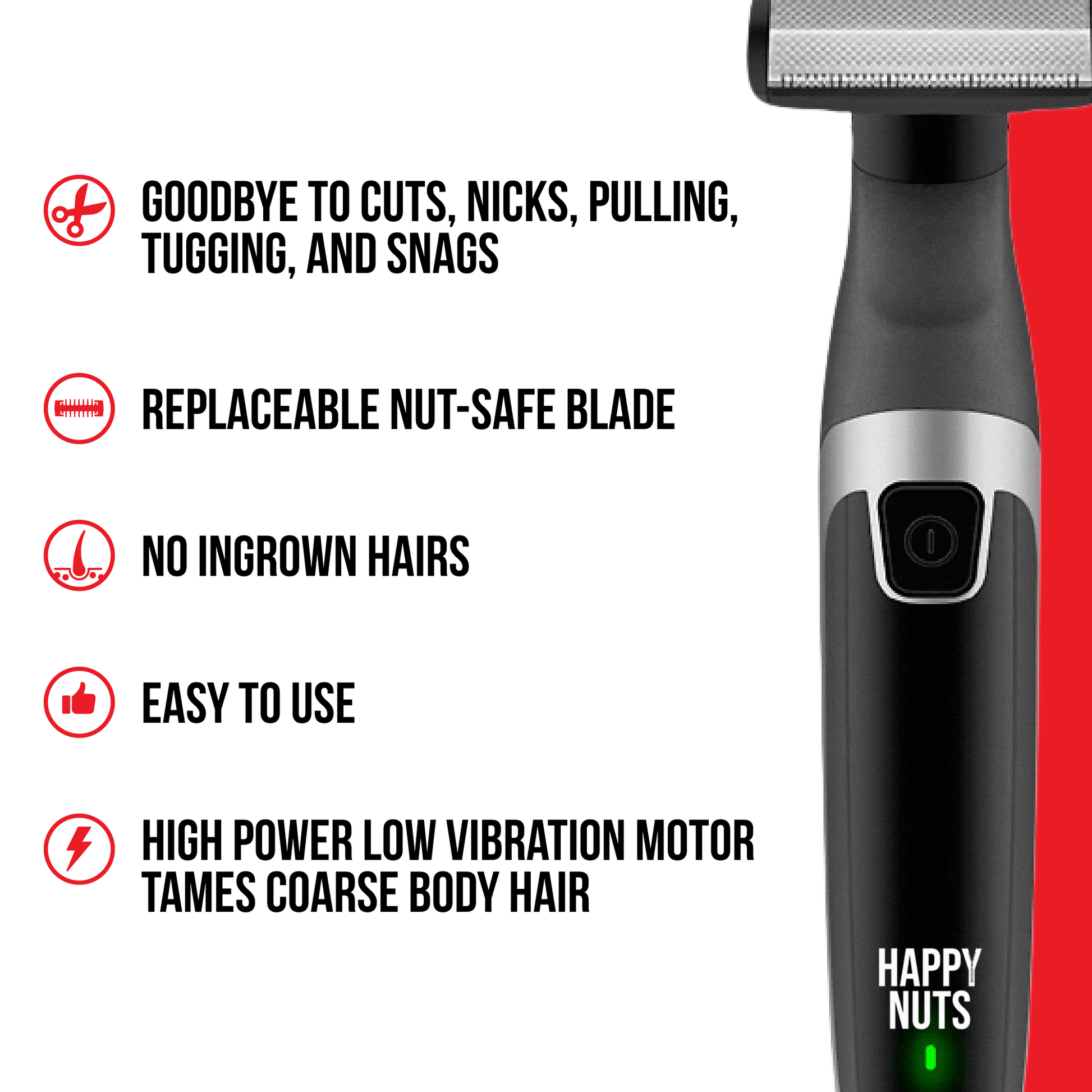 The 30 degree pivoting body trimmer blade is engineered for nut-keeping. Say goodbye to cuts, nicks, pulling, tugging, and snags so you can groom with confidence.